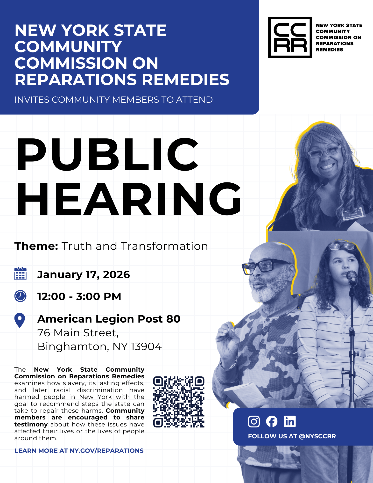 Following the business meetings, the NYSCCRR will host a public hearing on Saturday, Jan. 17, 2026, from 12:00 p.m. to 3:00 p.m. at American Legion Post 80, 76 Main Street, Binghamton, NY 13904. Community members are invited to share experiences, insights, and testimony to help shape the Commission’s recommendations on reparations remedies in New York State.